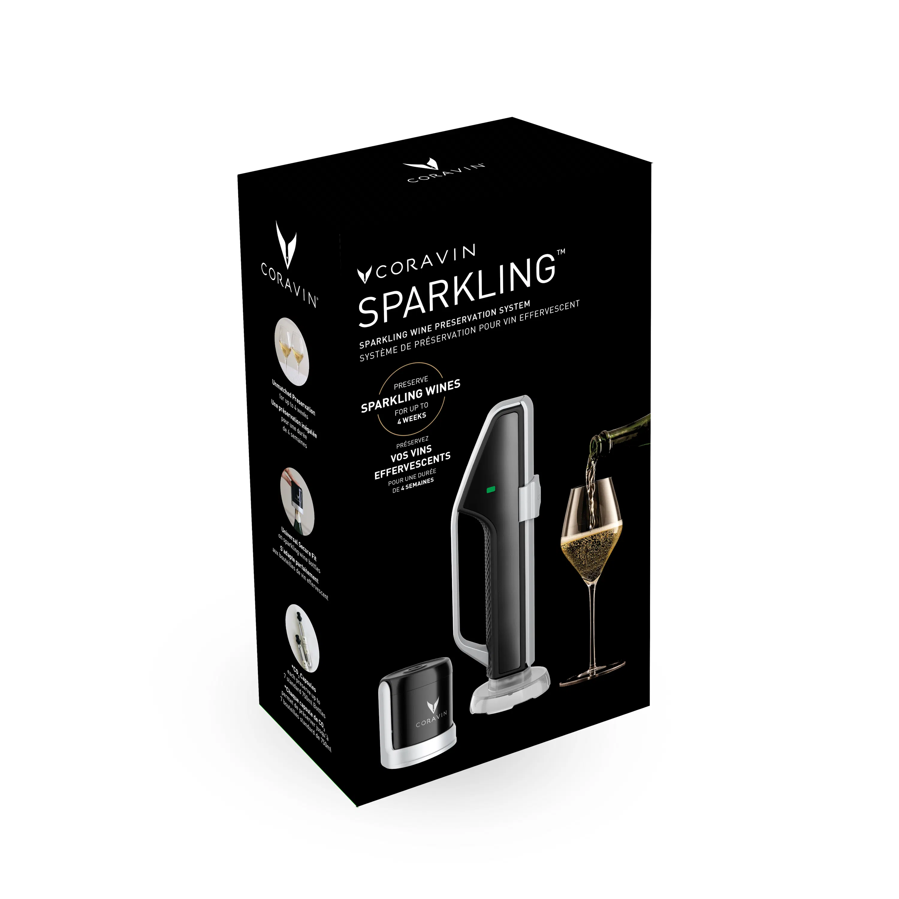 Coravin Sparkling ist das erste Konservierungssystem für Schaumweine, das die Aromen, den Geschmack und die Bläschen Ihrer Lieblingsschaumweine bis zu vier Wochen lang bewahrt und dafür sorgt, dass das letzte Glas genauso köstlich ist wie das erste. Jetzt können Sie jederzeit ein Glas Champagner, Prosecco, Cava usw. geniessen, ohne auf einen besonderen Anlass warten zu müssen.